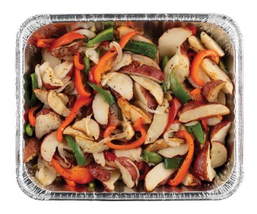 Lightly browned, oven-roasted Potatoes tossed with Red & Green Peppers, Spanish Onions, Parsley, Olive Oil and Salt & Pepper Must be reheated before serving. Serves 10-12