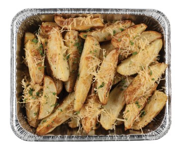 Golden brown fried Potato Wedges seasoned with Salt & Pepper and then baked with shredded Parmesan Cheese Must be reheated before serving. Serves 10-12