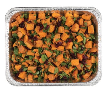 Chunks of Steamed Sweet Potatoes mixed with Baby Spinach, Dried Cranberries, Sugared Walnuts, Olive Oil, Salt & Pepper Must be reheated before serving. Serves 10-12